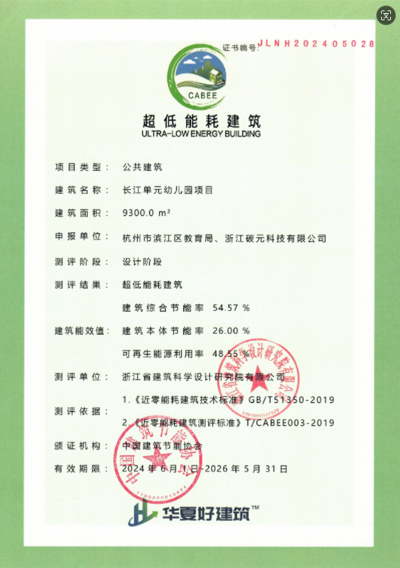 长江单元幼儿园项目获中国节能协会颁发超低能耗建筑证书!