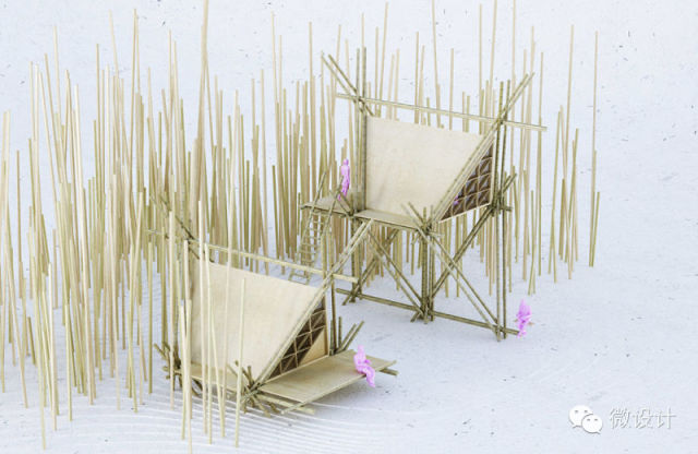 各个方向的竹竿集结于同一个结点,从而起到固定整个构架的作用。新增的水平楼层构成人们的活动空间,并与支撑梁相连接。网格的宽度是470cm,楼层之间的高度是400cm。结构底层被抬升以适应各种不同的地形条件。通过将不同方向的竹竿集结并固定于同一结点,我们得到了规模和功能各不相同的人字形三角体:不同大小的卧室、供家庭使用的大三角、用作前厅或酒店的三角连体以及浴室或洗手间。